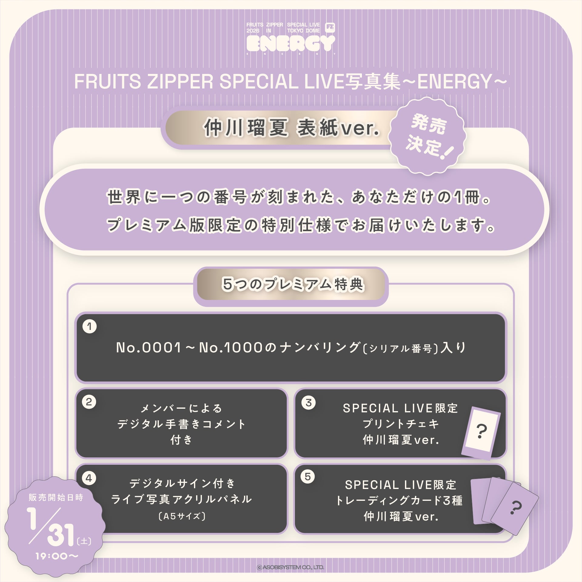 本商品は、「FRUITS ZIPPER SPECIAL LIVE写真集 〜ENERGY〜」PREMIUM版の仲川瑠夏表紙ver.です。